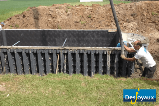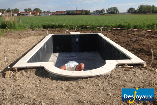 第三步是池体结构搭建。以Desjoyaux迪泉优泳池为例,采用围板结构系统,现场拼装成型(仓库预组装),并结合钢筋工程,形成整体框架。随后通过一次性浇筑混凝土,使池体成为一个完整的独立支撑结构,兼顾强度与稳定性。