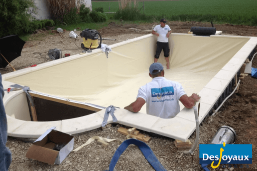 下一步是防水内饰安装。通过现场热熔安装防水胶膜,使泳池内部形成完整防水层,同时呈现最终的视觉效果。这一步不仅关系到美观,也直接影响泳池的长期使用表现。